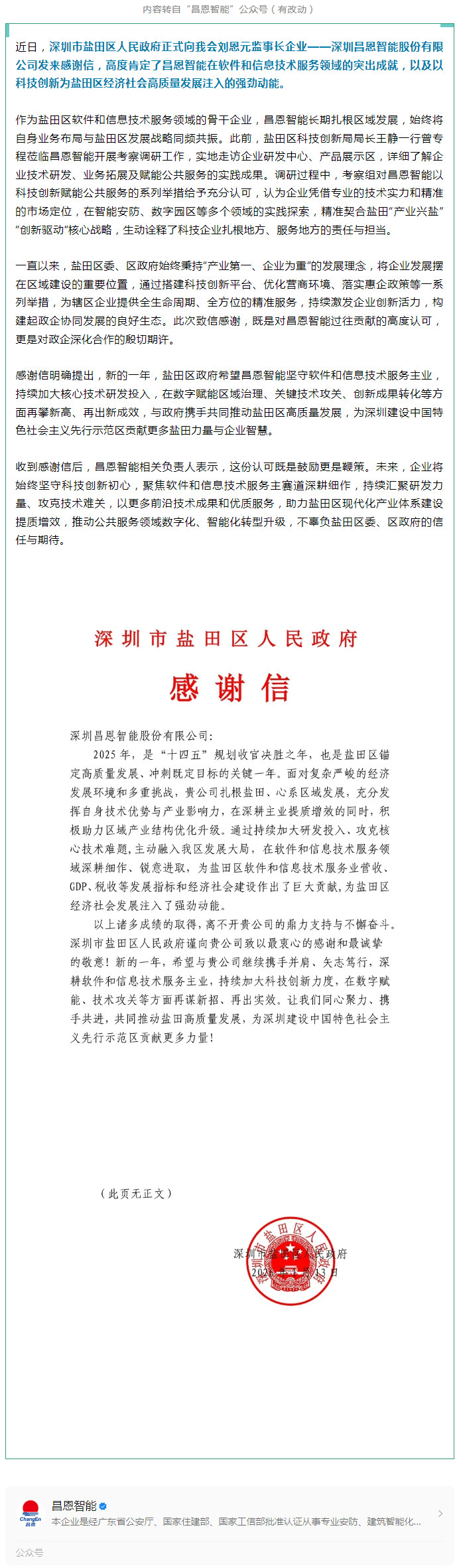 科技赋能显担当 盐田区政府致信感谢深梅商监事长企业昌恩智能