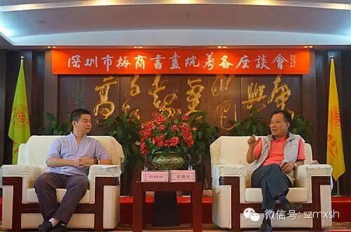 2014年10月11日,由驻会会长郭建导主持,深圳市梅商书画院筹备座谈会在佳嘉豪商务大厦20楼会议室顺利召开。余锋光会长,曾震宇执行会长,常务副会长罗梅曾、杨建生、黄惠娟、陈尚坚、欧玫,我会理事、梅商书画院第一任院长何柏俊,秘书长吴胜昌等我会领导,陈健、罗慎健、罗洪东、张增文、叶生茂、叶国辉等梅县籍书画艺术家及其爱好者一共30多人齐聚一堂,共商梅商书画院未来发展大计。