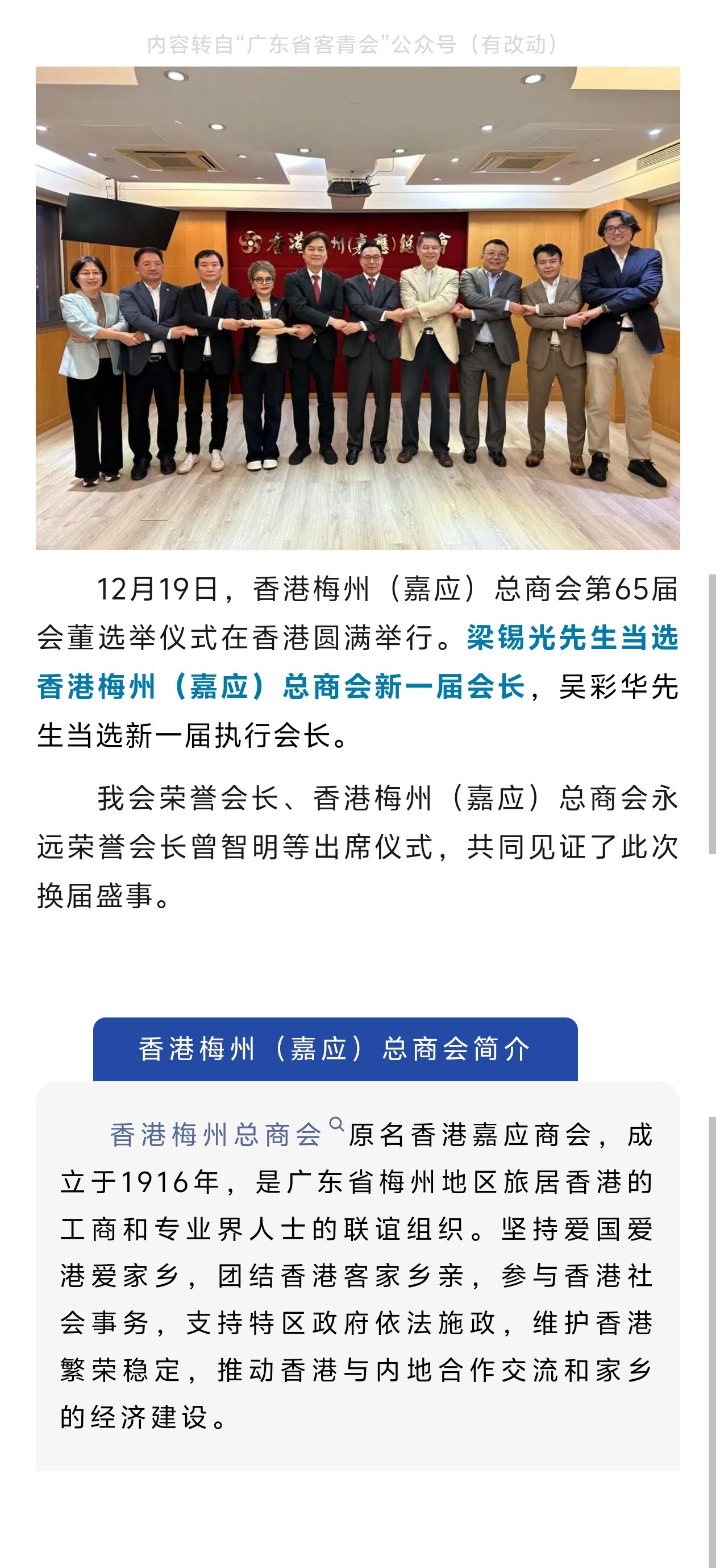 热烈祝贺我会梁锡光常务副会长当选香港梅州(嘉应)总商会新一届会长